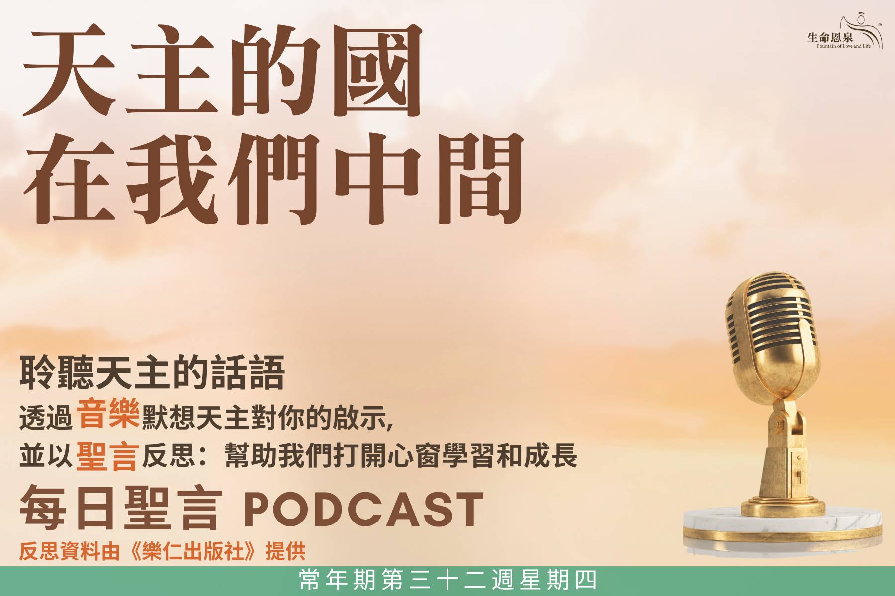 天國何時來臨?這是今天人在心中常尋問的一個問題。生從何來,死往何去。這個人生基本問題,無時無刻不在困擾人的心靈,反省生命歸屬無疑是嚴肅的。法利塞人向耶穌尋問的,正是人在心底追問的。那麼,耶穌當時回答的,能安慰我們當下的所有憂思嗎?福音給我們的肯定是:天主的國就在你們當中。這同樣是耶穌所愛門徒給我們肯定的:「天國離你們並不遠,就在你口裡,就在你心裡。」緊緊跟隨主耶穌,不斷深入十字架奧跡中,讓我們永遠活在和主相偕的天國路途中。