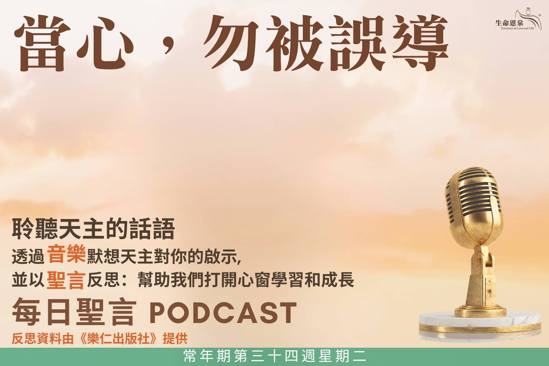 那時候,有些人正談論聖殿是用美麗的石頭,和還願的禮品裝飾的,耶穌說:「你們所看見的這一切,待那時日一到,沒有一塊石頭留在另一塊石頭上,而不被拆毀的。」他們遂問說:「師傅!那麼,什麼時候要發生這些事?這些事要發生的時候,將有什麼先兆?」耶穌說:「你們要謹慎,不要受欺騙!因為將有許多人,假冒我的名字來說:我就是(默西亞);又說:時期近了。你們切不可跟隨他們。你們幾時聽見戰爭及叛亂,不要驚惶!因為這些事必須先要發生,但還不即刻是結局。」耶穌遂又對他們說:「民族要起來攻擊民族,國家攻擊國家;將有大地震,到處有饑荒及瘟疫,又將出現可怖的異象,天上要有巨大的凶兆。」 —上主的福音。