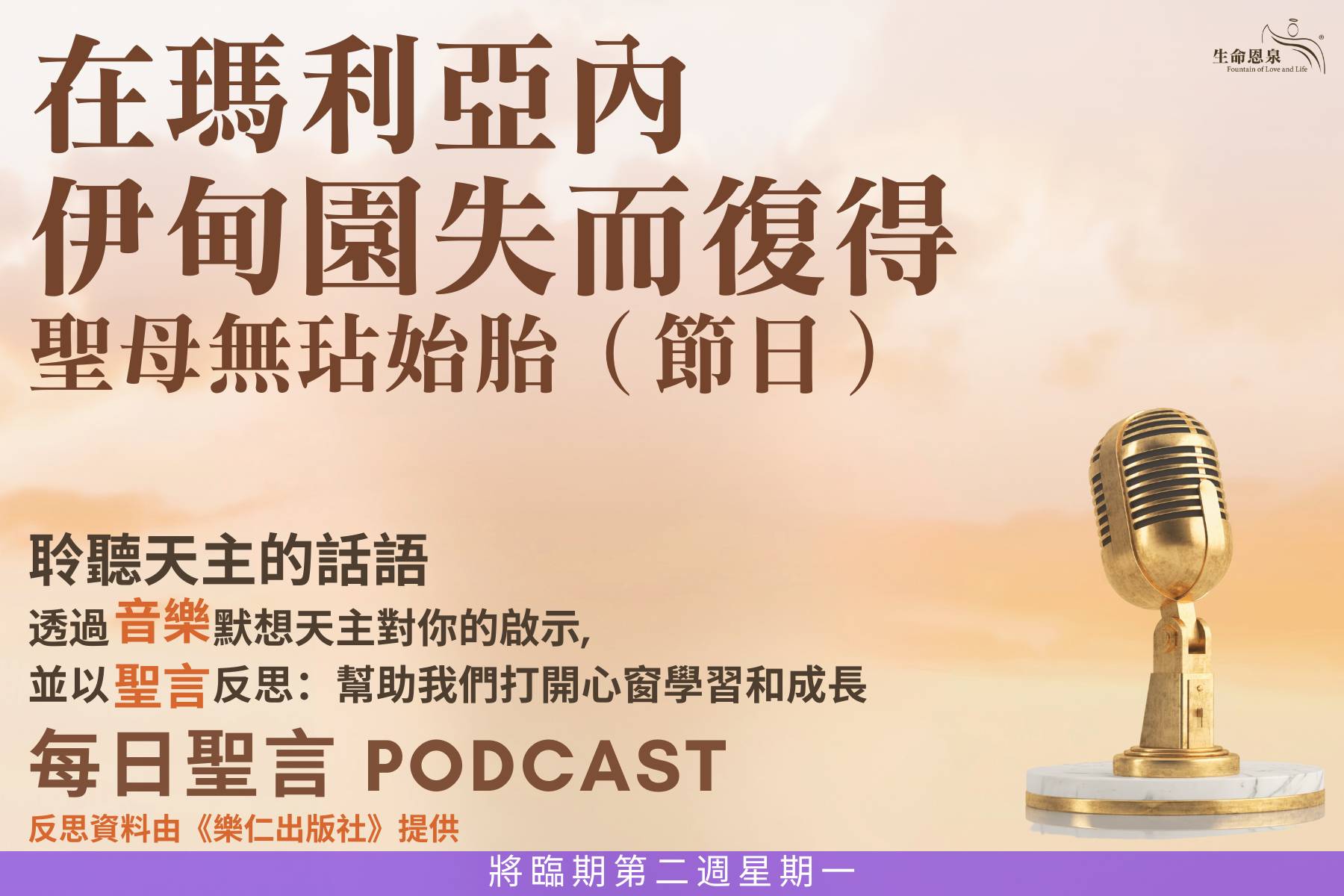 到了第六個月,天使加俾額爾奉天主差遣,往加里肋亞一座名叫納匝肋的城去,到一位童貞女那裏,她已與達味家族中的一個名叫若瑟的男子訂了婚,童貞女的名字叫瑪利亞。天使進去向她說:「萬福!充滿恩寵者,上主與你同在!」【在女人中你是蒙祝福的。】她卻因這話驚惶不安,便思慮這樣的請安有什麼意思。天使對她說:「瑪利亞,不要害怕;因為你在天主前獲得了寵幸。看,你將懷孕生子,並要給他起名叫耶穌,他將是偉大的,並被稱為至高者的兒子,上主天主要把他祖先達味的御座賜給他,他要為王統治雅各伯家,直到永遠;他的王權沒有終結。」瑪利亞便向天使說:「這事怎能成就?因為我不認識男人。」天使答覆她說:「聖神要臨於你,至高者的能力要庇蔭你,因此,那要誕生的聖者,將稱為天主的兒子。且看,你的親戚依撒伯爾,她雖在老年,卻懷了男胎:本月已六個月了,她原是素稱不生育的,因為在天主前沒有不能的事。」瑪利亞說:「看!上主的婢女,願照你的話成就於我罷!」天使便離開她去了。 —上主的福音。