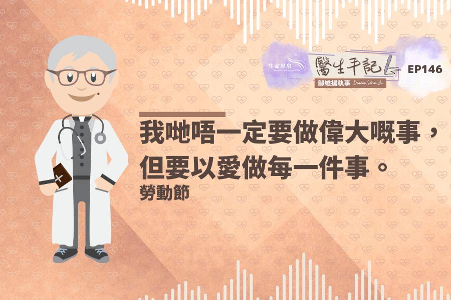 Podcast電台節目 【醫生手記】Ep146 – 我哋唔一定要做偉大嘅事,但要以愛做每一件事。 | 勞動節 by Keith Fung 2025-09-06 2025-09-06 我們的工作是有價值且神聖的,因為當我們全心全意以愛去服務他人,我們自己也會得到平安和快樂。 標籤勞動節勞工主保生命教育愛心反覆思慮價值觀醫生手記退休兒科醫生鄔維揚執事鄔執事執事坦誠愛人如己天主教生命恩泉聖若瑟醫生分段節目類別醫生手記講者鄔維揚執事 Deacon John Wu語言粵語 FacebookTwitterPinterestEmail 相關資訊 醫生手記 【醫生手記】Ep152 – 天主一定會聽我哋禱告,但我哋有冇鍥而不捨咁祈禱呢? | 鍥而不捨的精神 2025-10-18 【醫生手記】Ep151 – 你向世界報以微笑,世界會以微笑回饋你! | 以愛回報世界 2025-10-11 【醫生手記】Ep150 – 耶穌小時候祈禱係用咩經文㗎? | 聖詠 2025-10-04 【醫生手記】Ep149 – 點先可以結好果子嚟光榮天主? | 自由基本的定義 2025-09-27 【醫生手記】Ep148 – 點解耶穌會讚一個不忠實嘅管家? | 強項與弱點互補不足 2025-09-20 【醫生手記】Ep147 – 每個星期日都望彌撒,你有冇問過點解? | 光榮十字聖架 2025-09-13 瀏覽更多相關節目/資訊 其他音頻分段節目 【每日聖言】時代的徵兆 | 常年期第二十九週星期五 2025-10-23 【每日聖言】我為帶火而來 | 常年期第二十九週星期四 2025-10-22 【每日聖言】自由而警覺 | 常年期第二十九週星期三 2025-10-21 【每日聖言】在罪惡中休戚與共 | 常年期第二十九週星期二 2025-10-20 【每日聖言】富人在天主面前 | 常年期第二十九週星期一 2025-10-19 【每日聖言】信德、忠信 | 常年期第二十八週星期六 聖路加(聖史)(慶日) 2025-10-18 【醫生手記】Ep152 – 天主一定會聽我哋禱告,但我哋有冇鍥而不捨咁祈禱呢? | 鍥而不捨的精神 2025-10-18 【心聲傳情】野仔《一生旅行團》從遊客到朝聖者的心路 2025-10-17 【保祿家書】迦拉達書 Ep 07 – 迦 3:19-29 2025-10-17 【神修話語】二零二五年十月十八日 2025-10-17 【駱曦 愛生命 隨想】二零二五年十月十八日 2025-10-17 【每日聖言】在天主手中 | 常年期第二十八週星期五 聖依納爵主教.安提約基亞(殉道)(紀念) 2025-10-16 【每日聖言】人人因信德而得救 | 常年期第二十八週星期四 2025-10-15 【每日聖言】禍哉!你們法利塞人 | 常年期第二十八週星期三 聖德蘭.亞維拉(大德肋撒)(貞女、聖師)(紀念) 2025-10-14 【每日聖言】你們內心中所擁有的 | 常年期第二十八週星期二 2025-10-13 【每日聖言】今日的門徒 | 常年期第二十八週星期一 2025-10-12 【醫生手記】Ep151 – 你向世界報以微笑,世界會以微笑回饋你! | 以愛回報世界 2025-10-11 【每日聖言】言語變為行動 | 常年期第二十七週星期六 2025-10-10 【神修話語】二零二五年十月十一日 2025-10-10 【駱曦 愛生命 隨想】二零二五年十月十一日 2025-10-10 【每日聖言】耶穌比邪惡更強而有力 | 常年期第二十七週星期五 2025-10-09 【每日聖言】祈禱不輟 | 常年期第二十七週星期四 2025-10-08 【每日聖言】天主切願人人得救 | 常年期第二十七週星期三 2025-10-07 【每日聖言】待客之道 | 常年期第二十七週星期二 玫瑰聖母(紀念) 2025-10-06 瀏覽更多分段節目